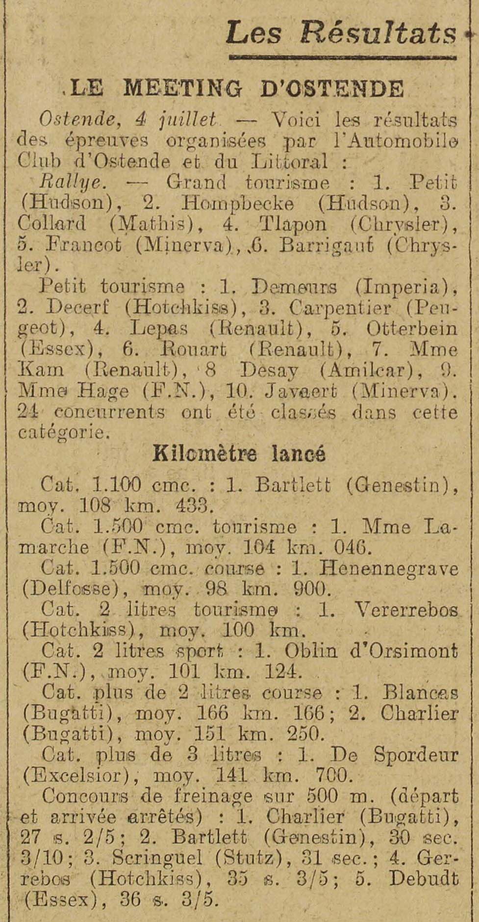 Descriptif : article page 4, compte rendu du meeting automobile de Chateau-Thierry. Charles Delfosse termine 1er de la catégorie 1500 course. La voiture est équipée d'amortisseurs Hartford. Il pulvérise au passage le record de l'épreuve pour cette catégorie.