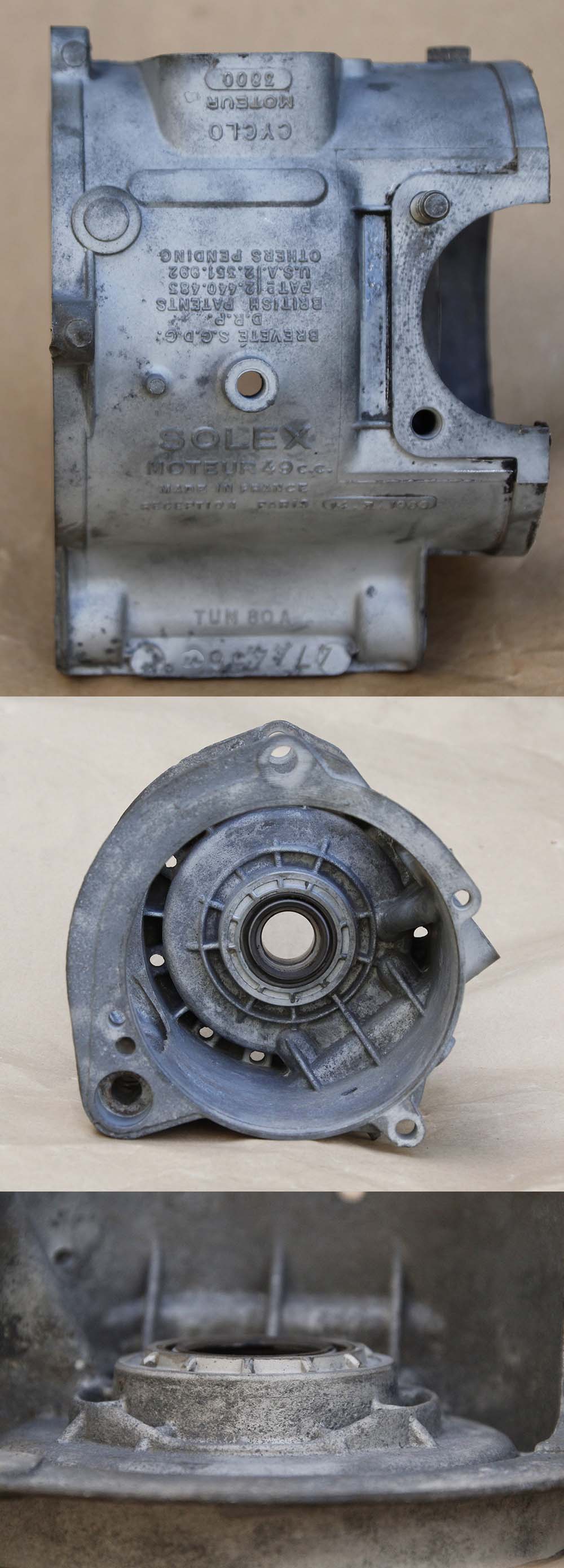 Première génération de carter avec galet de 42 mm et joint spi - taille 21,5 X 40 X 1,5 / 5. Le pourtour du roulement n'est pas renforcé, le carter d'embrayage est lisse. Il porte l'inscription "3800" sur le devant du moteur. Mais la date d'homologation est encore celle du 2200.