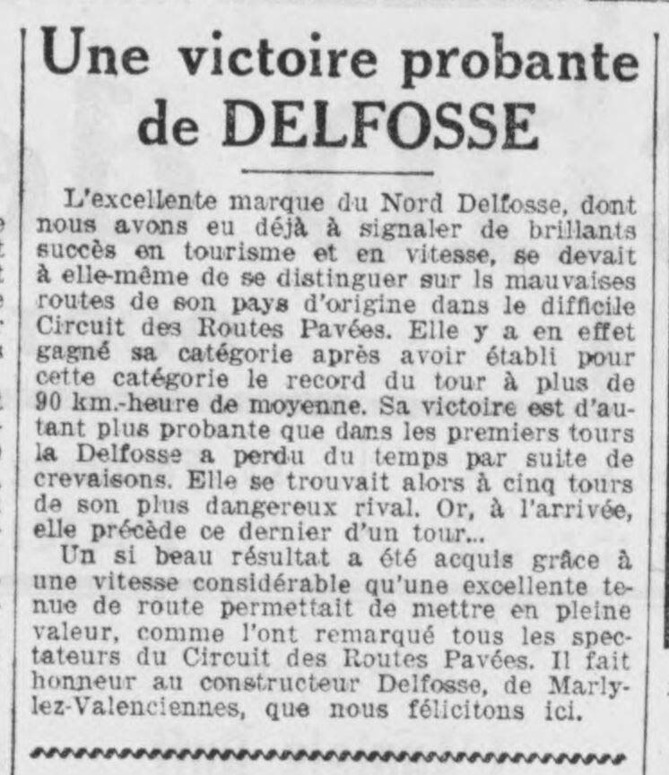 Descriptif : Après la victoire au circuit des routes Pavées en catégorie 1500 cc, Delfosse est mis à l'honneur dans la presse sous le titre "Une victoire probante de Delfosse".