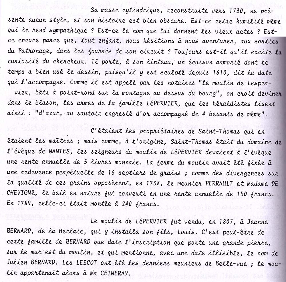 Lors du recensement de 1851, le moulin de Lépervier est la propriété de Julien Bernard et de sa femme Jeanne Allais, ainsi que de Louis Bernard et sa femme Perrine Daneau.